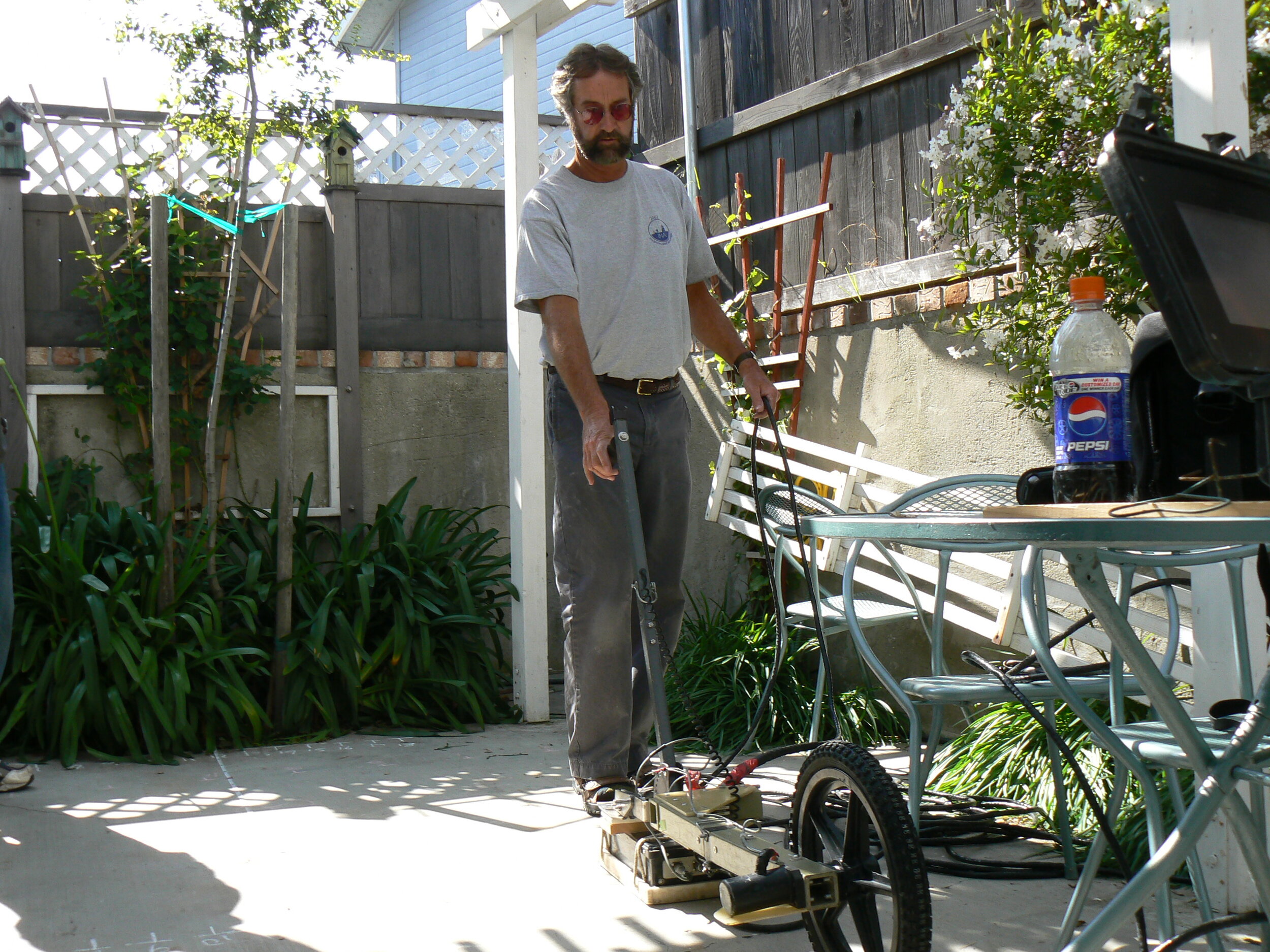 Professor Lawrence Conyers performs a Ground Penetrating Radar search of Susan Flores’ back patio, March 31, 2007 (courtesy Brenda Gillen)