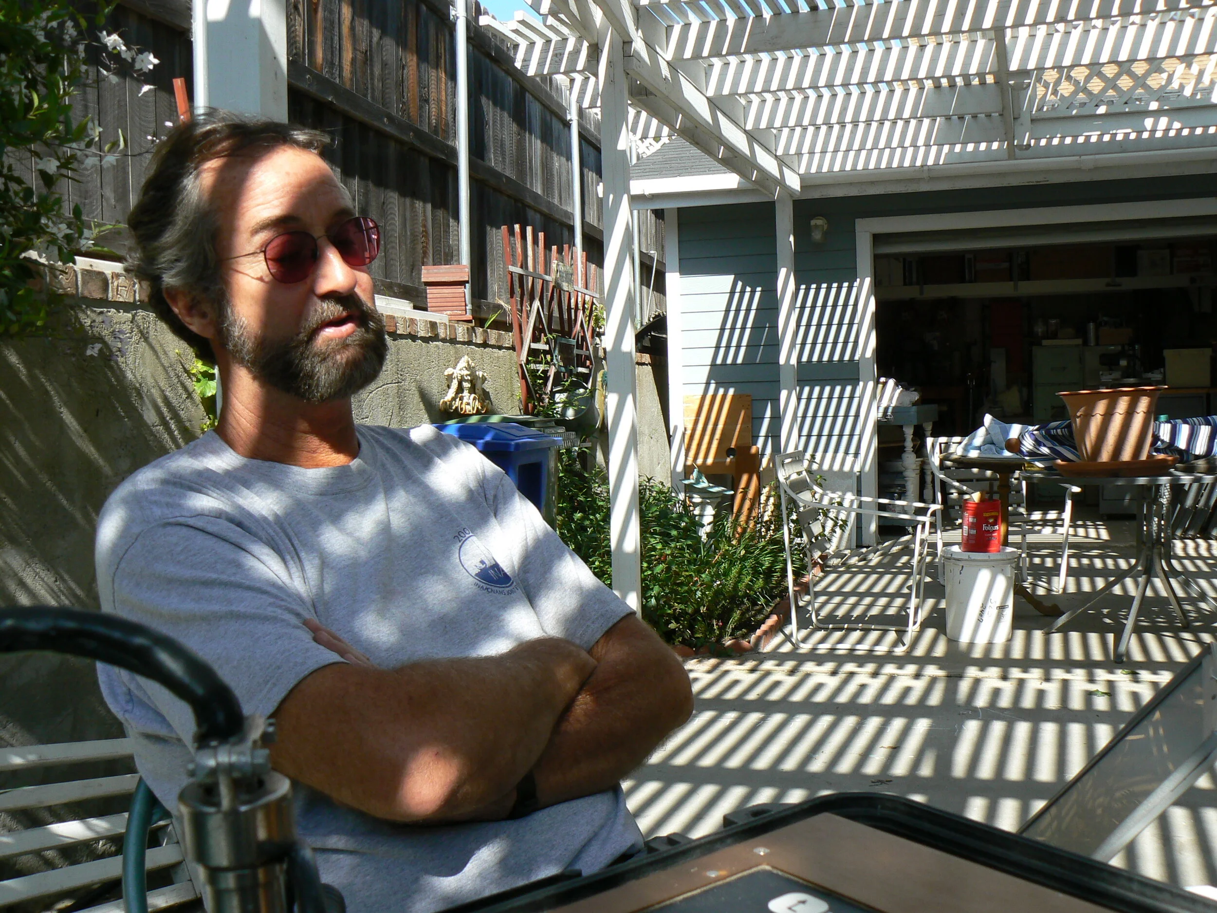 Professor Lawrence Conyers takes a break in front of Susan Flores’ garage, March 31, 2007 (courtesy Brenda Gillen)